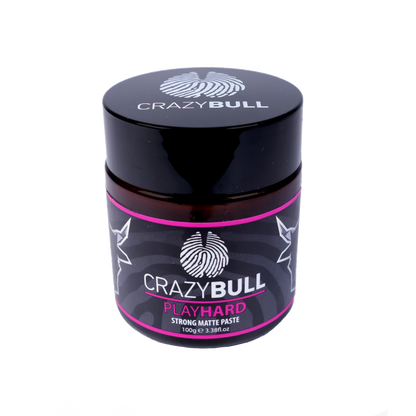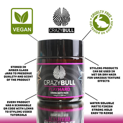 Work Hard, Play Hard! Crazy Bull's extreme texture paste,Play Hard provides your hair a high textured matte finish with a pliable, re-shapeable style hold designed to last from morning to evening (or even the next morning) and the water-soluble formula allows for it to be washed out with ease. Use it in a variety of hair types and styles, texture or comb, wet or dry application.